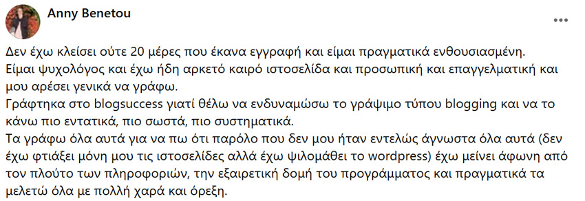 Μπήκα σε μια ομάδα υπέροχων ανθρώπων, ζεστή, φιλόξενη, με διάθεση για βοήθεια ο ένας προς τον άλλο. Σε όποιον σκέφτεται να παρακολουθήσει το Blog Success θα έλεγα ότι είναι η καλύτερη επιλογή για εκείνον και τους στόχους του. Χωρίς δεύτερη σκέψη, μακάρι να το είχα κάνει νωρίτερα!